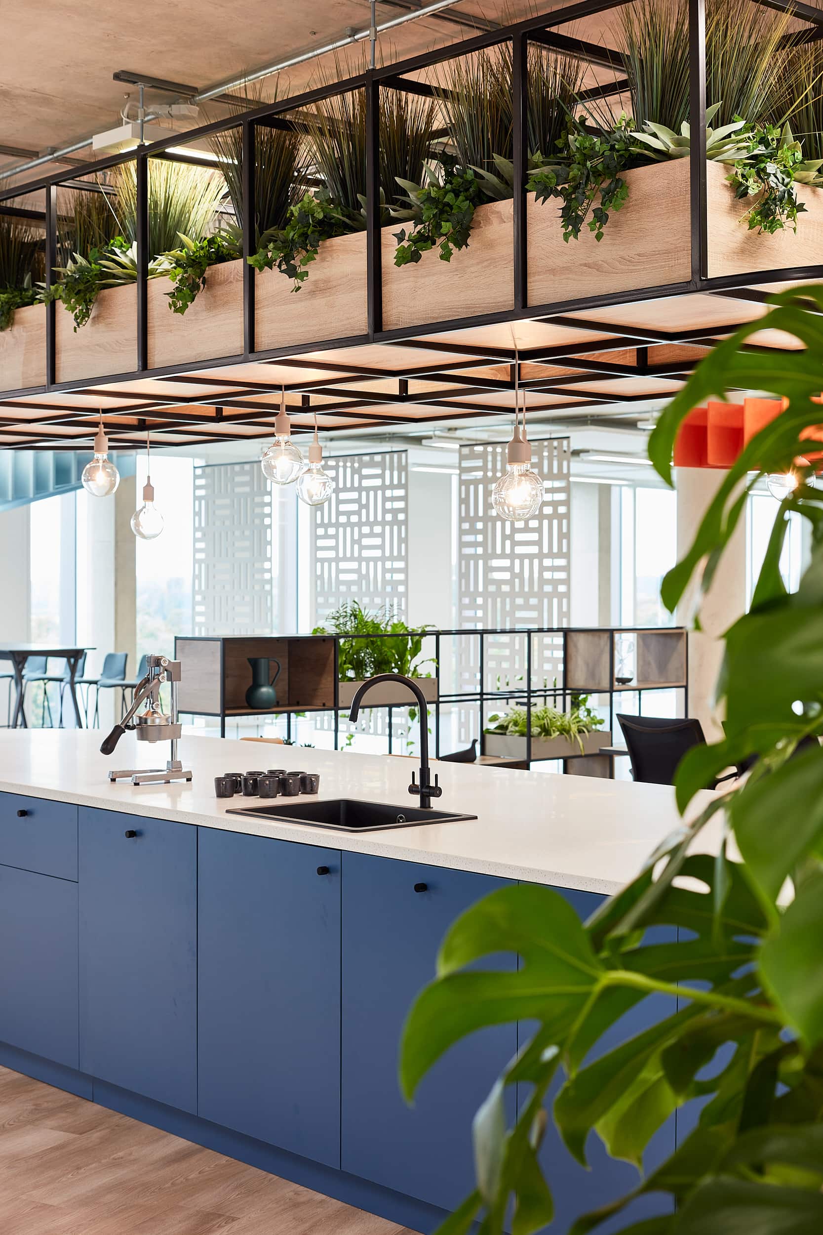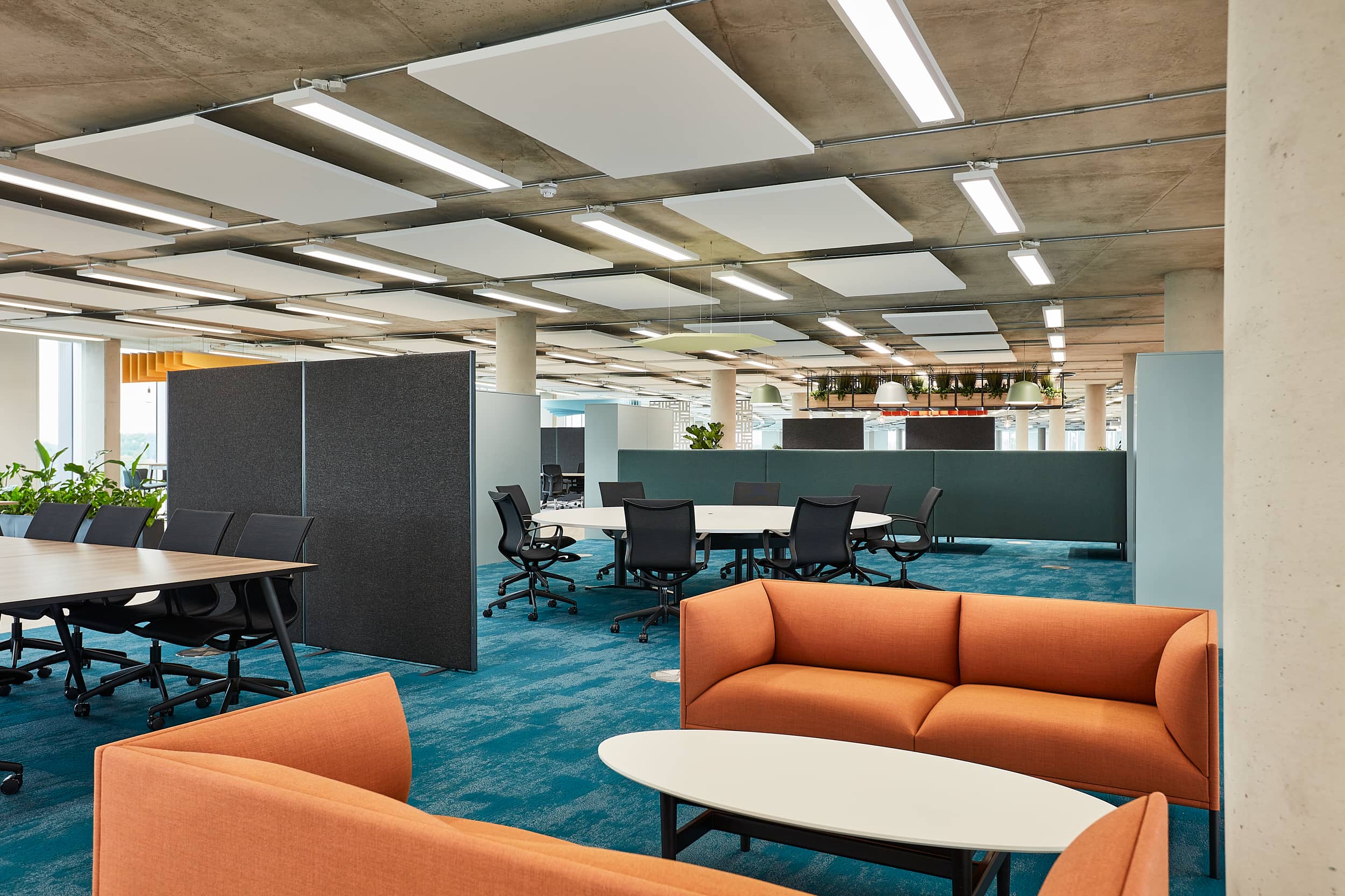 Embracing the value of first impressions we created an impressive building reception area that is open and collaborative, finished in an energetic and fresh palette. Upon entry visitors are greeted with a sleek, curved reception desk which then expands into a cafe-style seating area fit with tea point and a variety of relaxed seating for both socialising, meetings and independent work.
