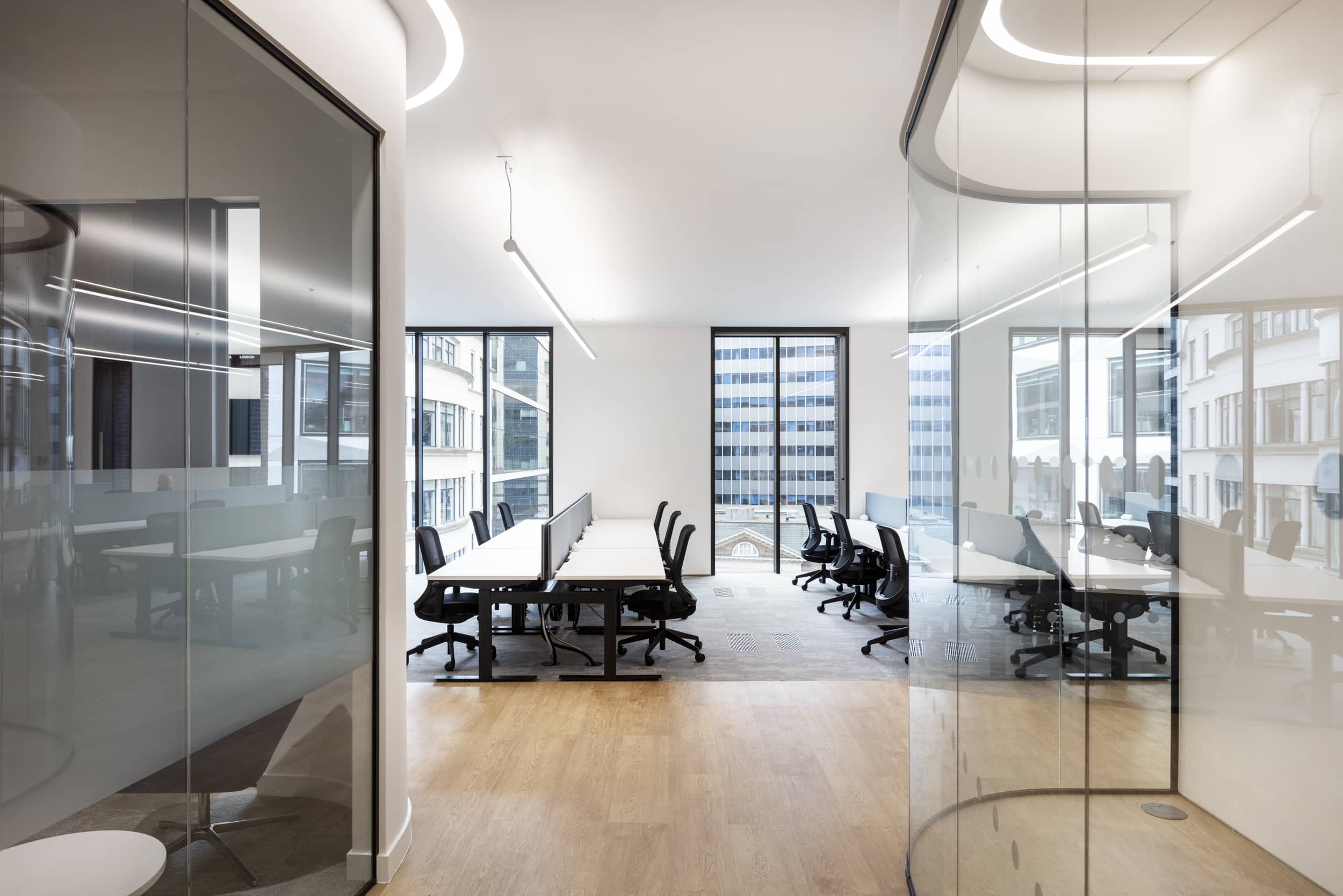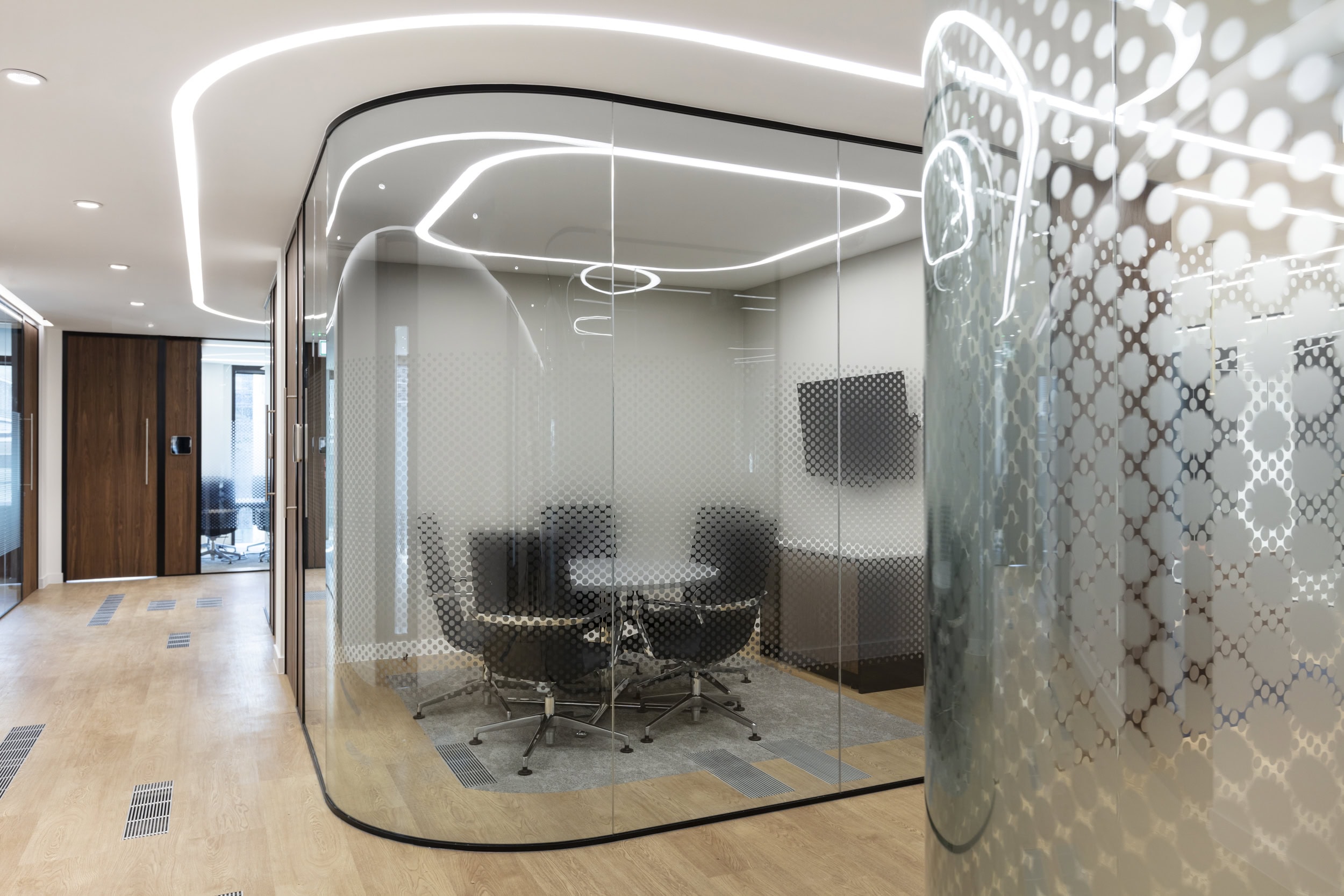 Client meeting rooms are formed of curved glazing and track lighting which follows a curvaceous framework. This creates an impressive client journey which takes them onto the multi-functional events room.
