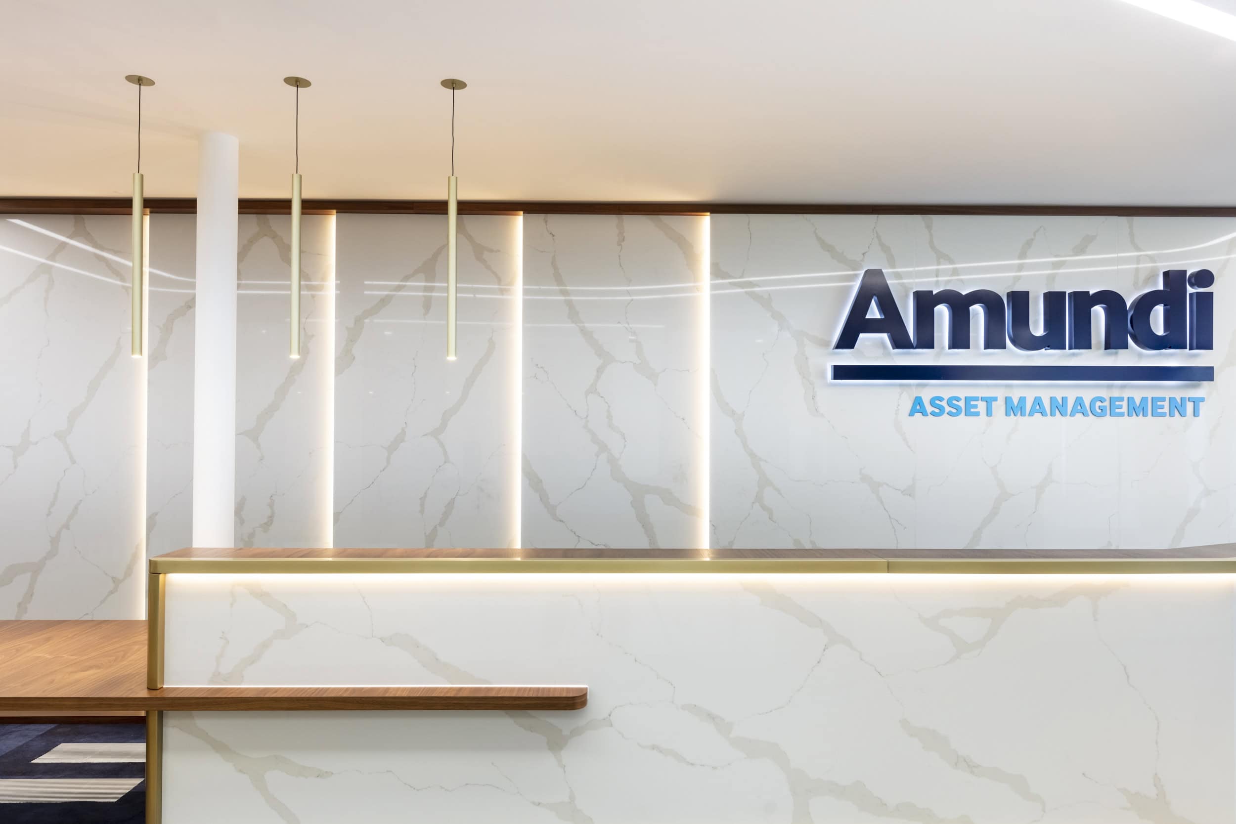 AIS responded by curating a modern, technology-infused design for Amundi’s European hub in London. The result: a collaborative workplace design that seamlessly connects global teams. The design strategically dismantles formality, creating a welcoming ambiance for client engagements. An impressive client journey unfolds from the reception’s backlit marble features to curved glazing in meeting rooms.