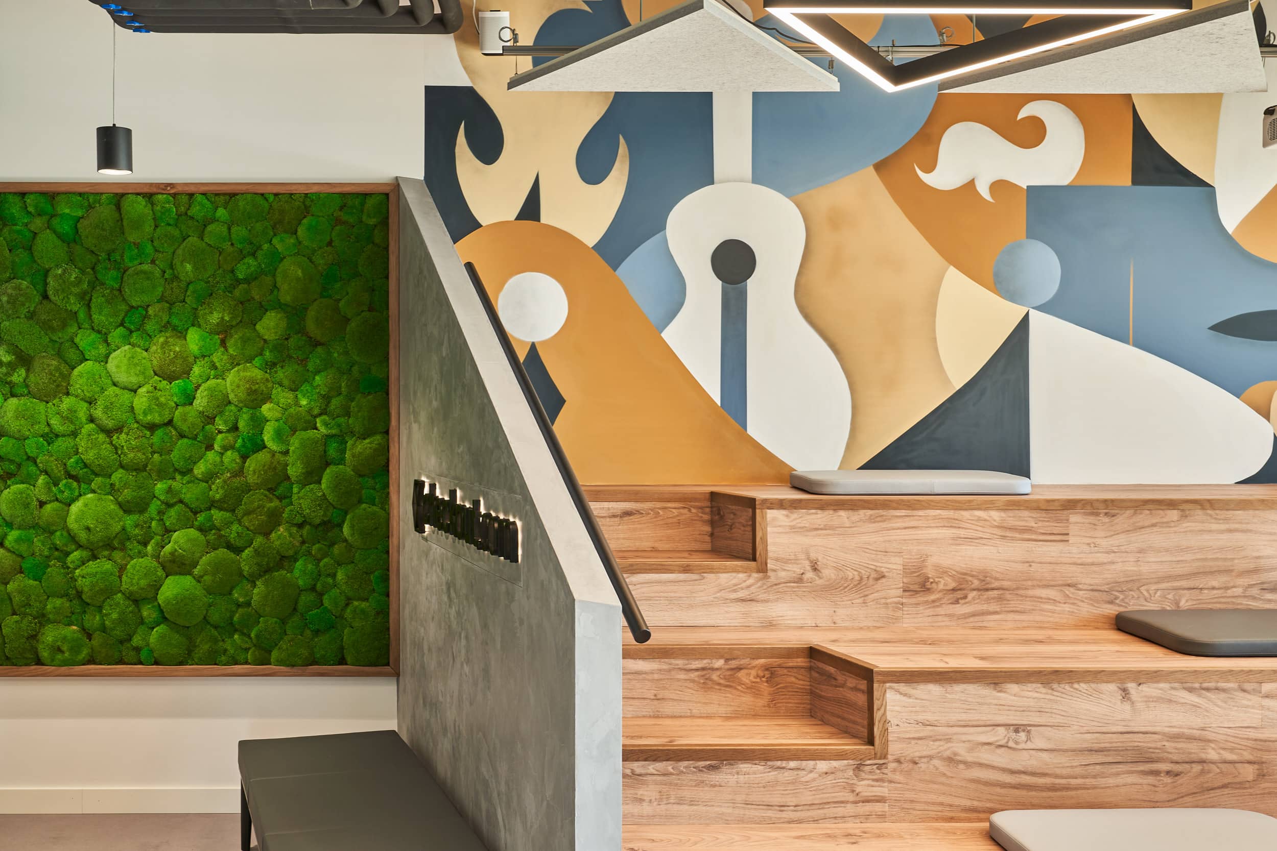 The tiered bleacher-style seating allows for easy transformation into an event area, connecting Checkout.com’s offices worldwide and facilitating company-wide presentations. To maintain a lively atmosphere, we employed a monochromatic colour palette alongside local street art and biophilic elements. Floor-to-ceiling windows span the entire space, flooding it with natural light, creating an open and uplifting ambiance on sunny days.