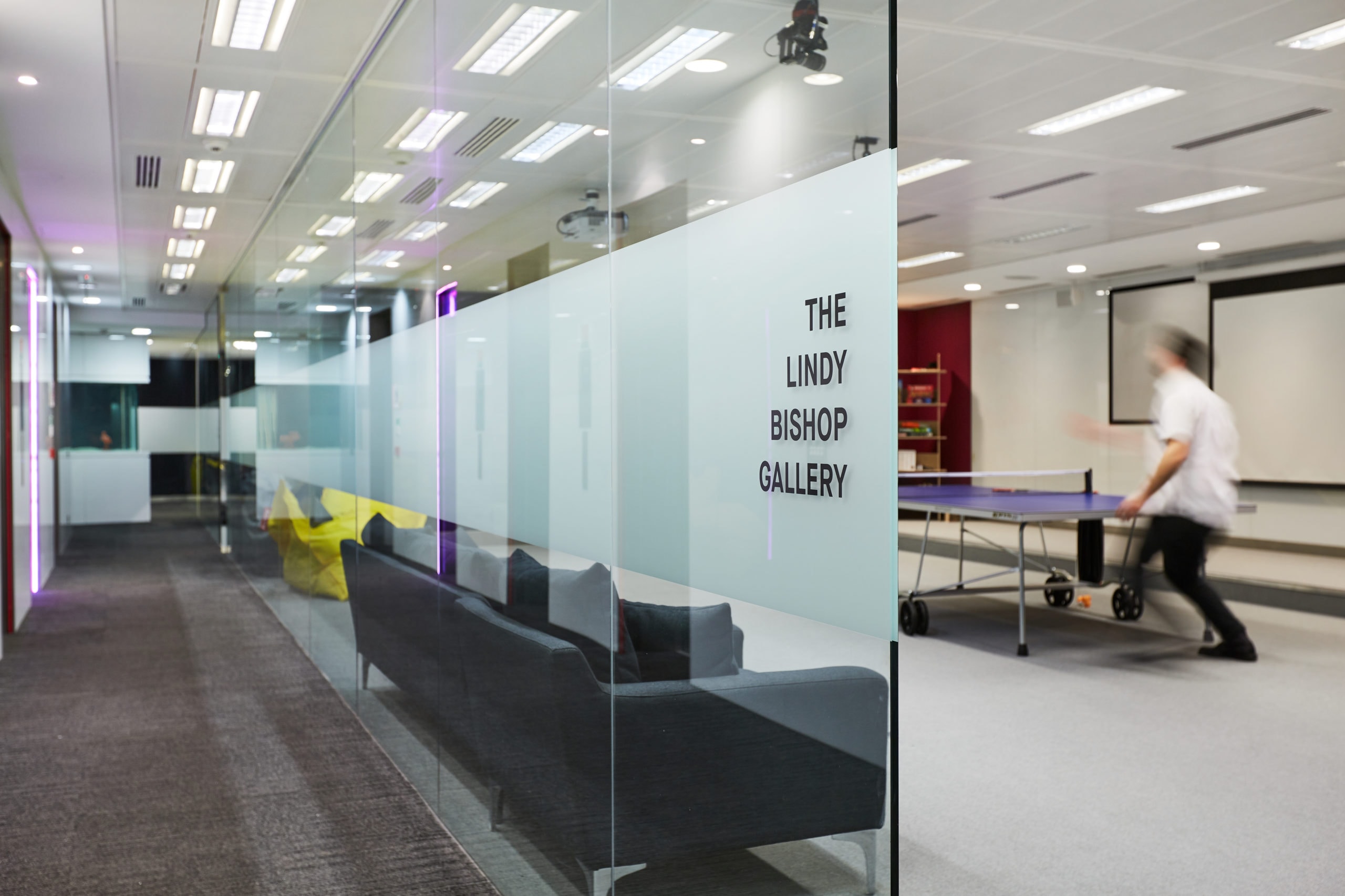 Elsewhere we incorporated two community spaces, the library space offers staff a quiet space, where they can get away from their desks and work in a more relaxed setting. While the second games room creates an escape in a different way, offering an opportunity to break in a more active way.