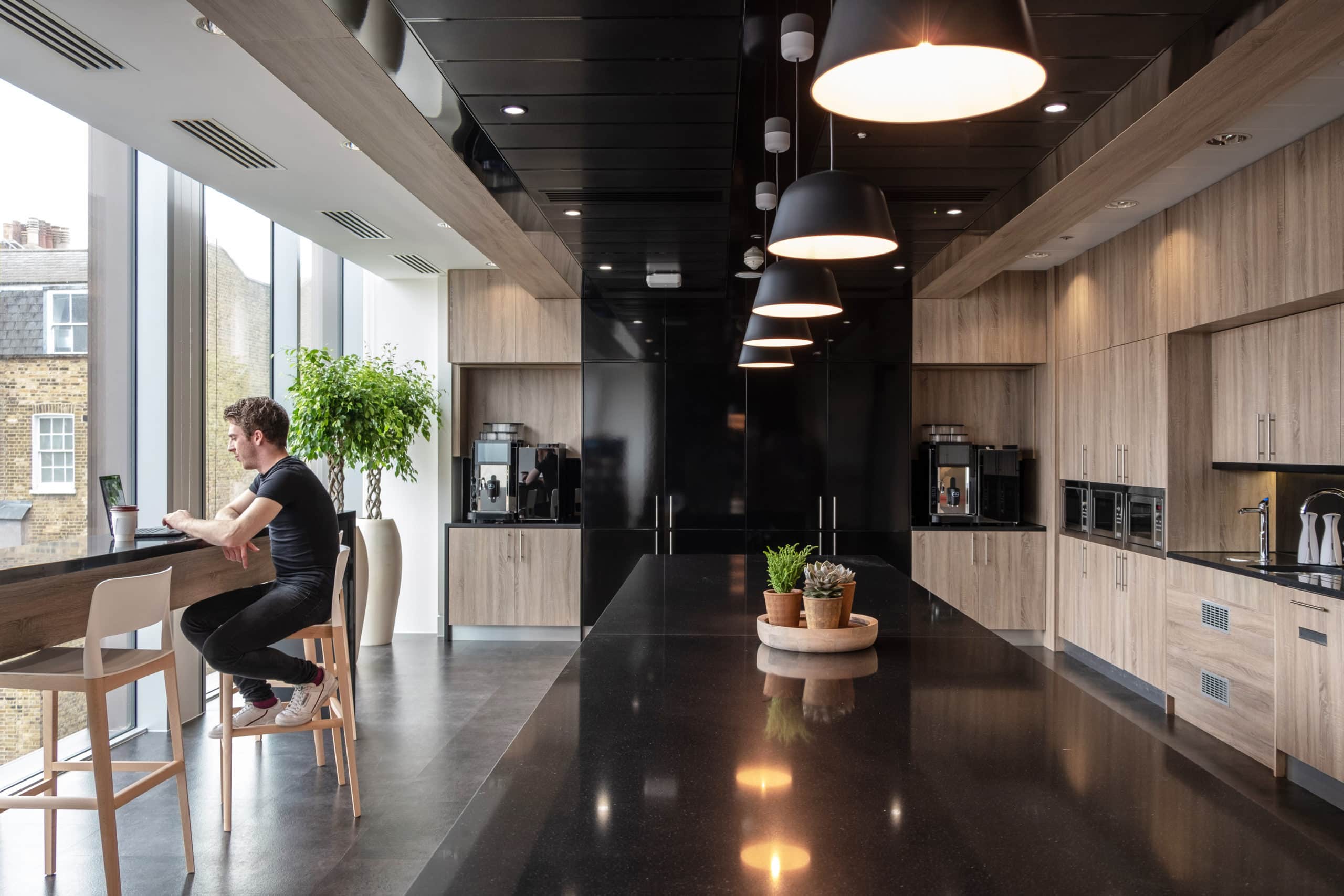 Central to the design is a large open plan kitchen where staff can take a break in a relaxed, family style setting, encouraging interaction between teams on a more social level. The space is light and bright and takes full advantage of the surrounding views, while the open plan bar style seating further facilitates interaction bringing people together and enhancing opportunities for collaboration.