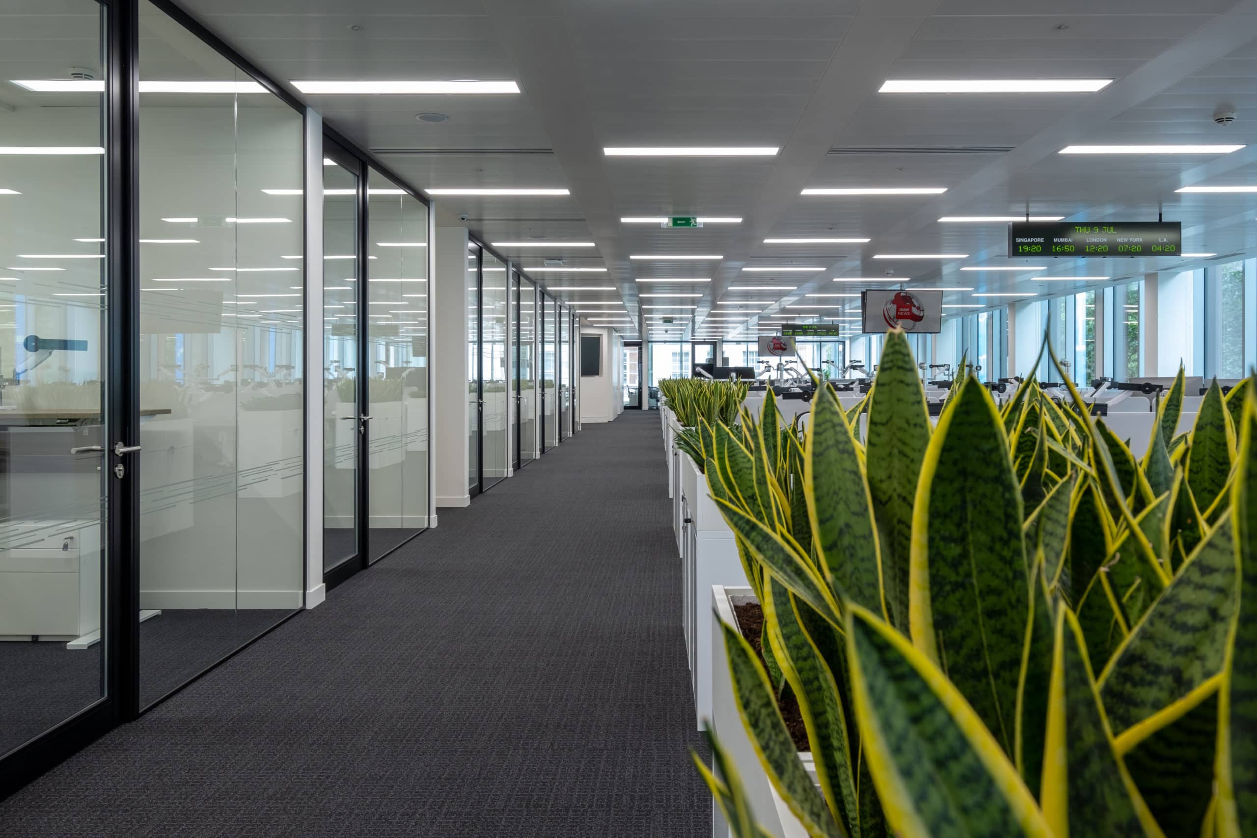 Sound-absorbing panels in the open plan maintain a quiet ambiance, while trading desks included integrated plant units for further sound absorption.
