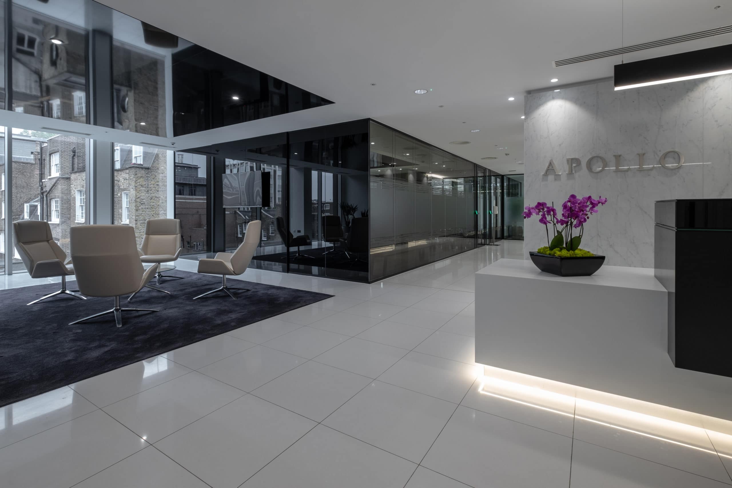 The project scope included full refurbishment works as well as mechanical and electrical works throughout to create a more refined aesthetic and functional space for the Apollo Global team. The space is elegant and sleek in style, combining minimalism and clean lines that come together to create a sophisticated style where staff can feel professional and valued.