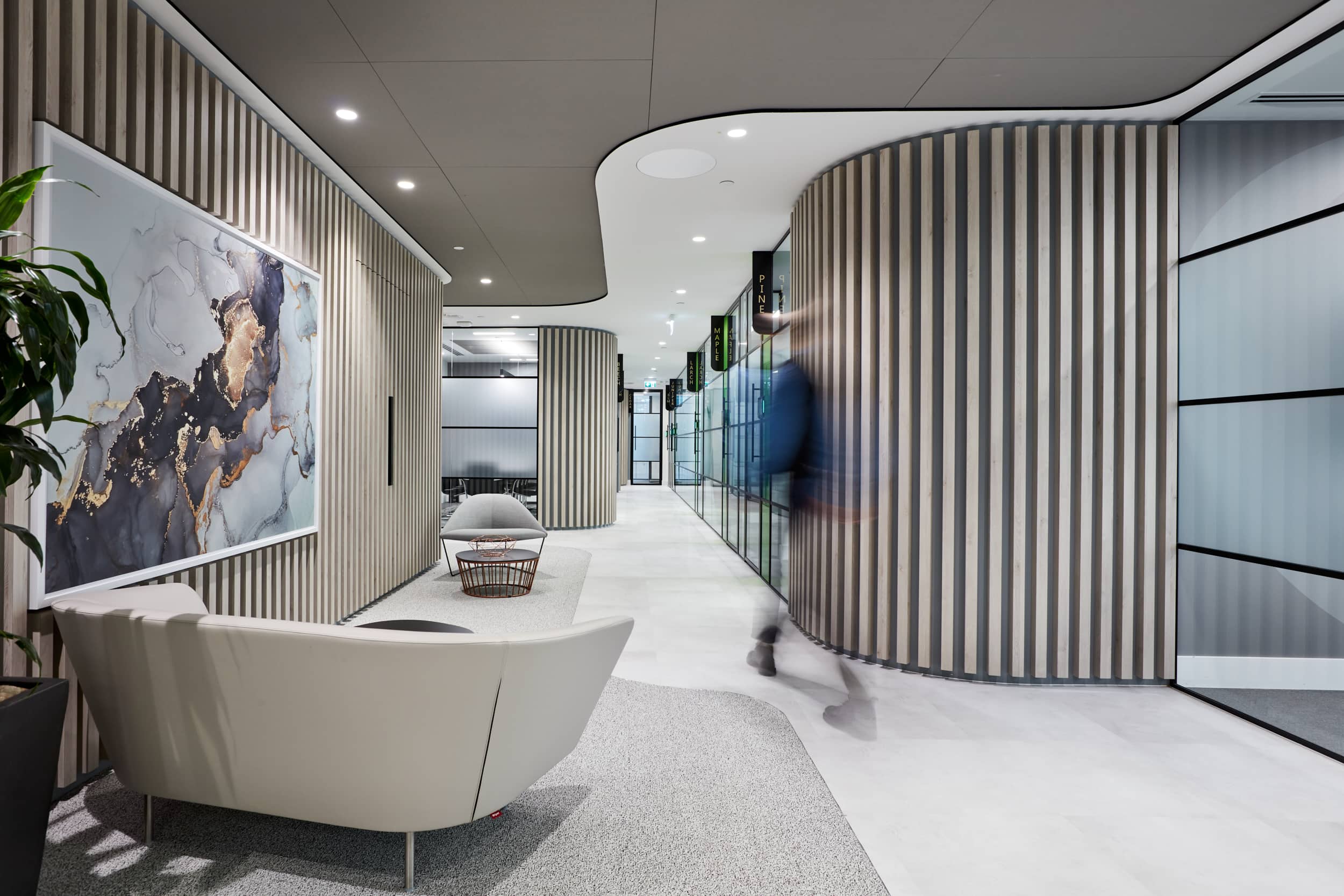 Stronger brand presence was created through the use of a refined materials palette featuring warm oak timbers and monochromatic surfaces, mixed with accents of the company brand colours that inject an element of vibrancy. The overall energy of the space is sophisticated and serene which combined with the company’s new branding will help see the MHA business to a stronger future.